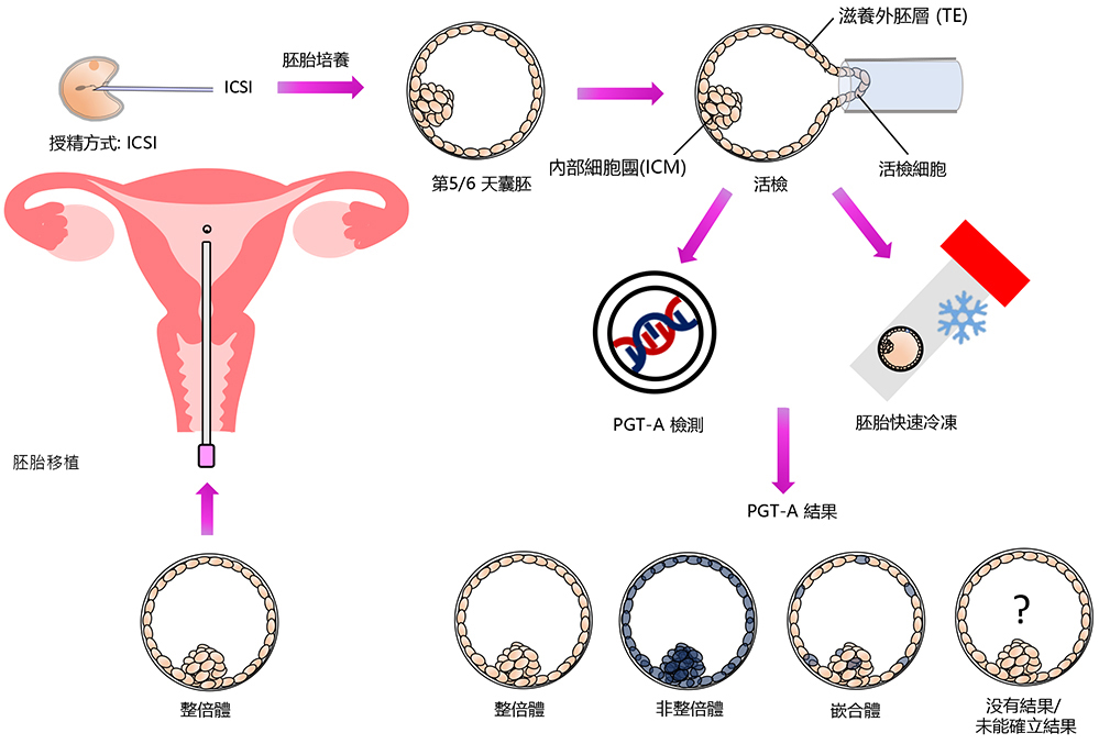 PGT-A的第一步是進行試管嬰兒(IVF)治療。每個卵子會通過 細胞漿內單精子注射(ICSI)令其受精,以避免多餘的精子黏附在卵子外壁而影響檢測結果。胚胎會被培養至第五或第六天成為 囊胚。
